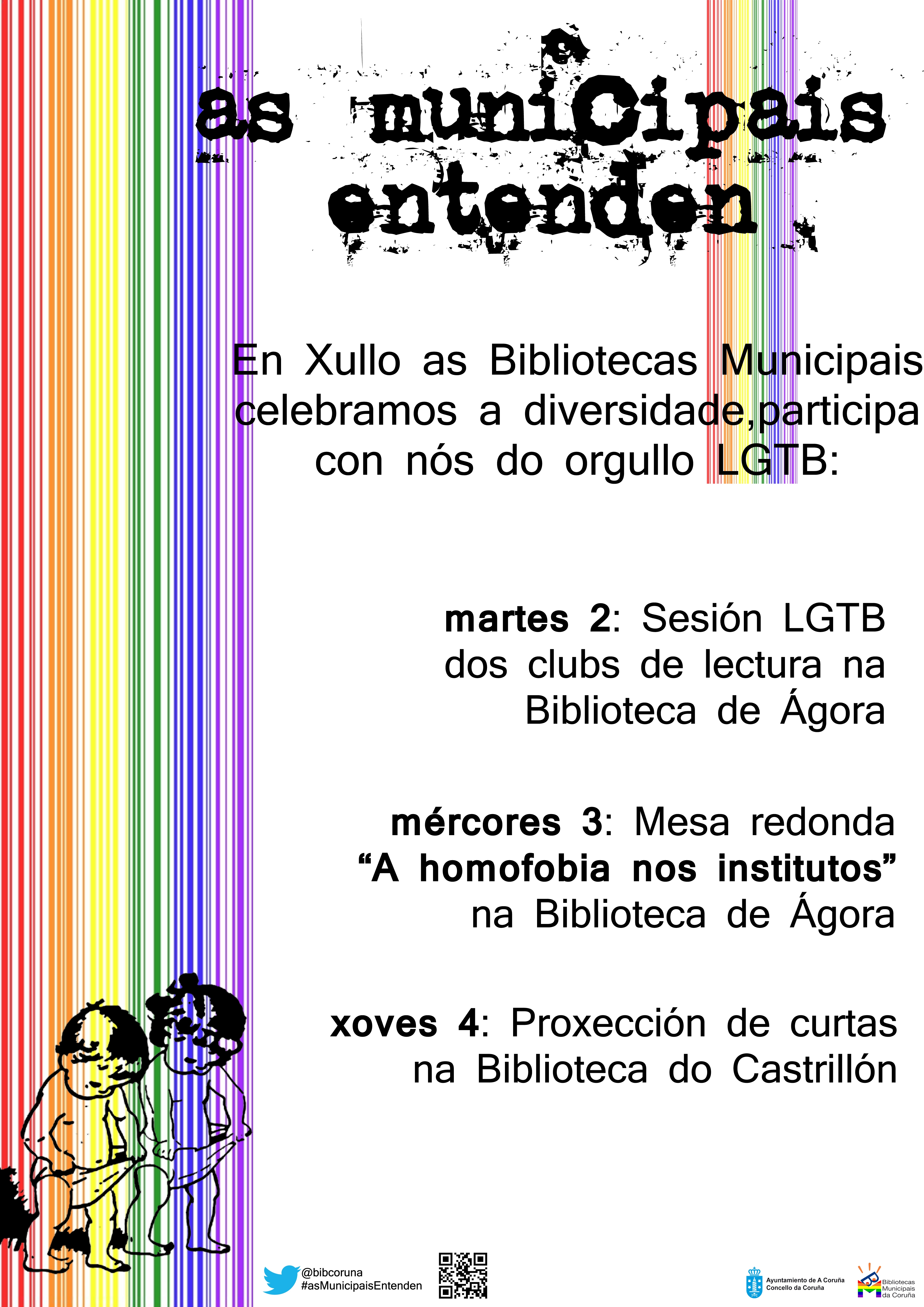 Mais non rematan aí as nosas propostas. Ao día seguinte realizaremos unha charla en Ágora, centrada na denuncia das formas de homofobia que se dan no ensino medio, e o día 4 remataremos o ciclo de actividades coa proxección de diferentes curtas sobre esta cuestión na Biblioteca do Castrillón. Chamade ás bibliotecas de noso e preguntade, ou consultade o noso perfil de facebook.