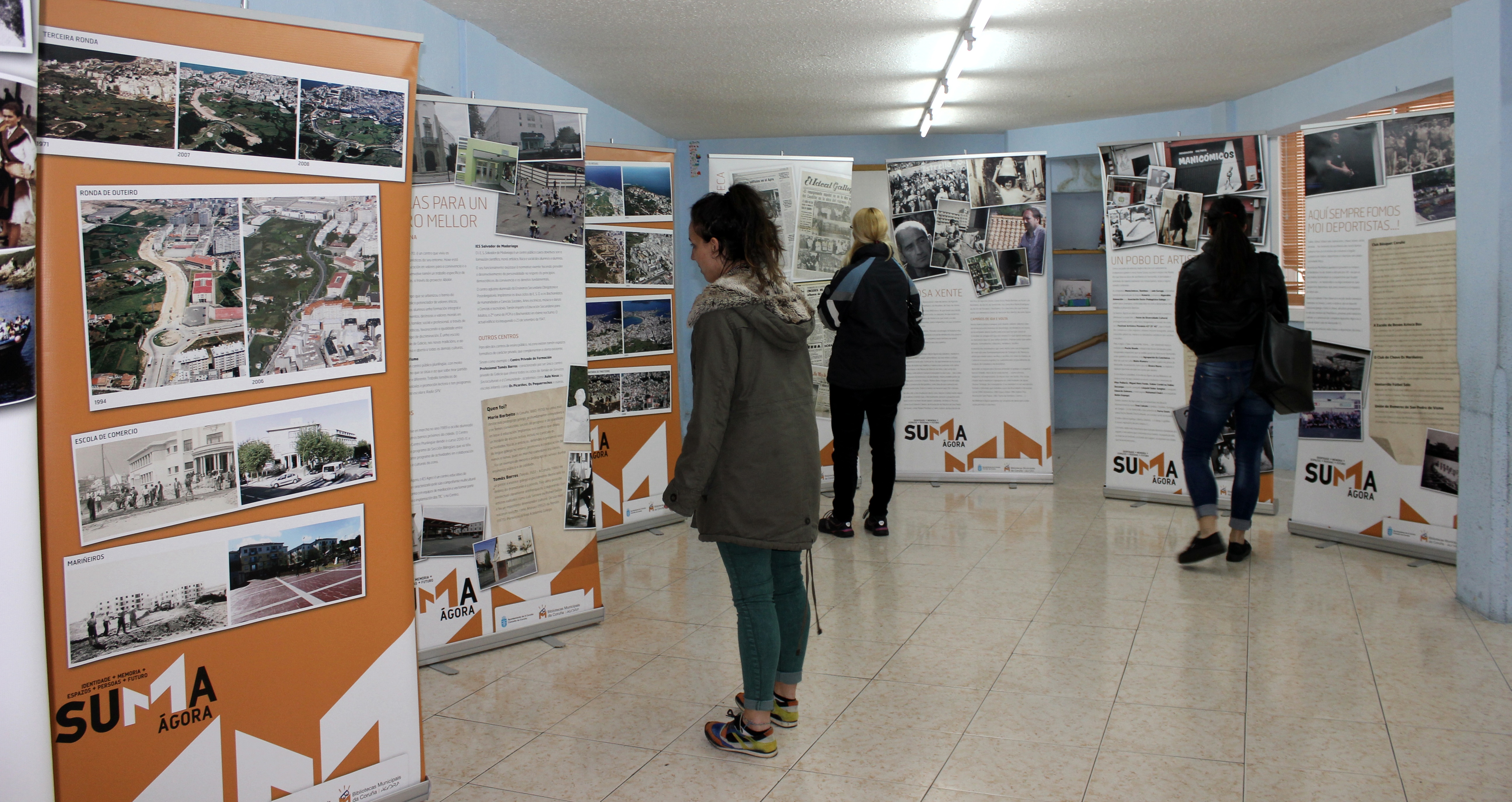 No seu momento presentámosvos neste blog a exposición Suma Ágora como unha iniciativa derivada do traballo bibliotecario cos colectivos do noso entorno e da recollida da memoria dos nosos barrios, realizado da man de parte da súa veciñanza. Estabamos interesados en achegar á xente que aquí vive, dunha forma accesible, contidos que puidesen resultar do seu interese, por ser xustamente ela a protagonista dos mesmos. Tratábase de traballar non tanto coa historia oficial dos barrios senón con aquilo que Unamuno denominara a intrahistoria, isto é, o cotiá, o local, o que conforma a malla diaria da vida á sombra do que se difunde desde o foco do saber académico ou do interese mediático.