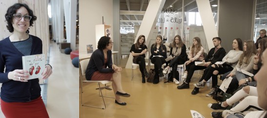 Á esquerda, Mitas Valencia agasalla lecturas en lingua galega ao alumnado do Istituto Benedetti Tommaseo na Libraría Suevia. A dereita, foto de grupo na Biblioteca Ágora con Nuria Martínez e eu mesma, despois da intensidade dos días compartidos.