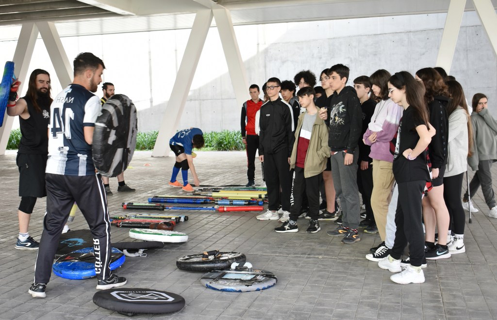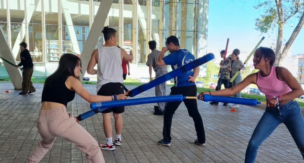 E chegamos ao cuarto punto do roteiro, un dos máis desfrutados e mellor valorados polo alumnado de 3º da ESO, onde na explanada da Biblioteca Ágora esperaba a Asociación Coruñesa de Jugger Coruña. Hai tempo que o exterior da biblioteca se converteu no lugar escollido polos mozos e mozas da cidade para practicar un dos deportes máis orixinais e descoñecidos polo público xeral, o jugger, unión da esgrima, xogos de pelota e un toque de loita grecorromana. Alí Brandon, César, Raposo, Gonzalo ou Pingu explicaron as tres tipoloxías de xogadores, o corredor, que a súa función é anotar tantos, os xogadores armados con armas ríxidas, nos que se fai presente a base do esgrima, e o ketteman, que conta cunha pelota unida cunha cadea que pode lanzar aos rivais. Unha experiencia que o alumnado desfrutou intensamente.