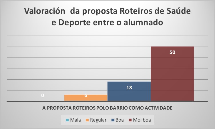 E non podiamos pechar esta nutrida experiencia sen saber que opinión lles mereceu aos mozos e mozas participar no Roteiro de Saúde e Deporte, posto que observar en que medida se están a cumprir cos propósitos de calidade é fundamento da nosa filosofía de traballo. Froito diso puidemos ver que o 91% do alumnado valorou como boa ou moi boa esta actividade para público xuvenil e, sen abafar con datos e resultados, isto danos folgos para seguir confiando nos roteiros de saúde e deporte como ferramenta para coñecer mellor a nosa contorna e poñer en valor os seus espazos e as súas xentes, especialmente aquelas vinculadas a diferentes disciplinas deportivas, e traballar valores relacionados co deporte e cunha vida máis saudable.