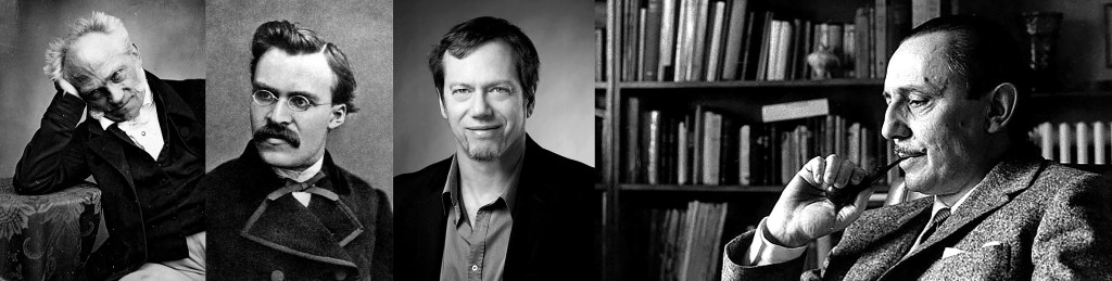 “Filósofos como Arthur Schopenhauer ou Friedrich Nietzsche son referentes filosóficos para min, mentres que polo lado do lecer, Robert Greene ou o teatro de Buero Vallejo son autores que me deixaron boa impresión. En literatura non teño preferencia de autores, adoito centrarme no contido e teño tendencia a separar obra de autor. De esquerda a dereita, Shopenhauer, Nietzsche, Robert Greene e Buero Vallejo.”