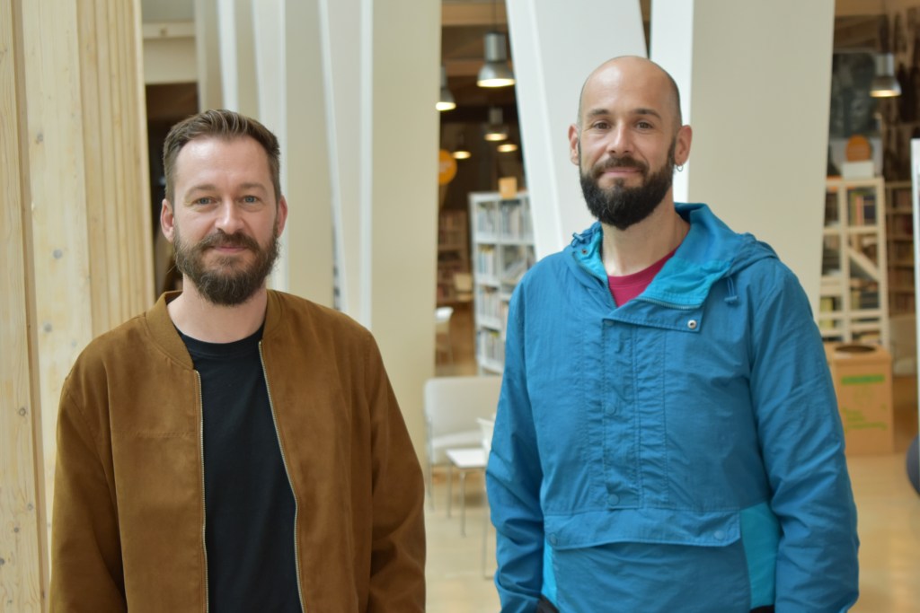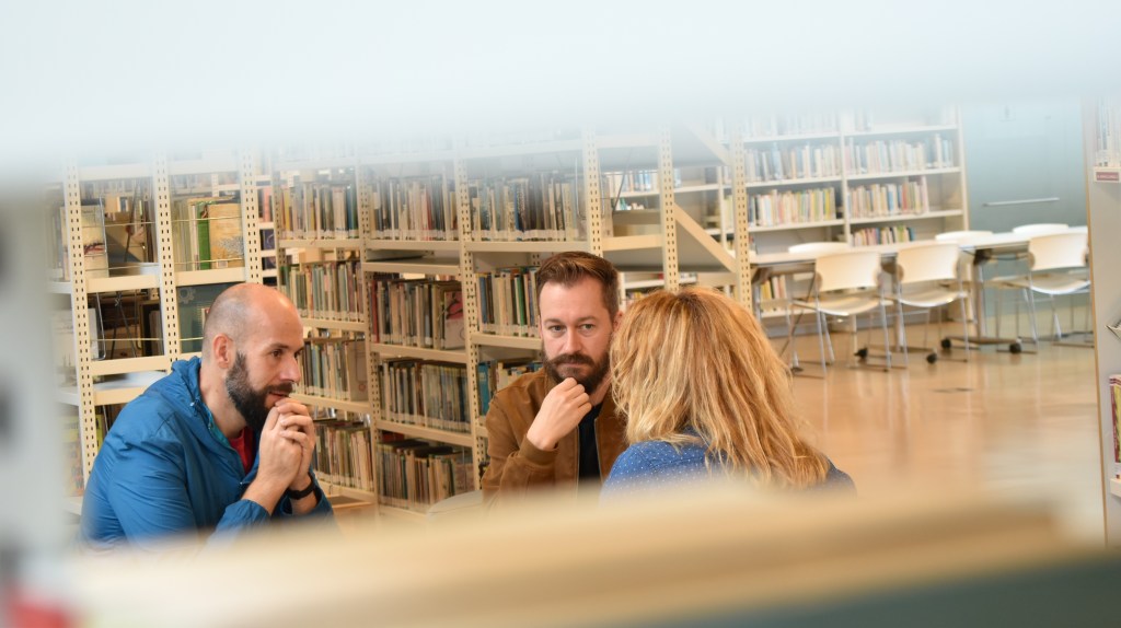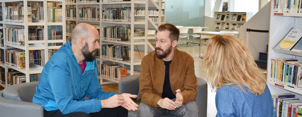 Juan mestura o traballo actoral e como creador coa produción cultural, xestionando o festival Tras o cristal coa libraría como espazo cultural. Leo é autor do libro álbum “Niños” da editorial Urbe Gráfica e socio doGalgo Azul. Imaxe da conversa mantida na Biblioteca Ágora.